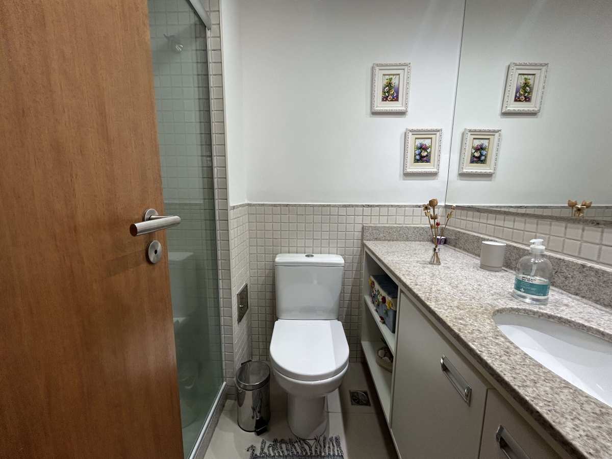 Cozinha moderna, equipada com armários planejados e bancada em granito preto. Área de serviço com acesso para a varanda. Banheiro social completo com box blindex, espelho e armários.